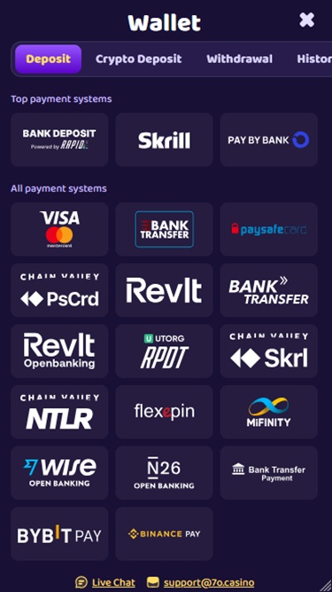 इसके अलावा, 7Oasis पर, आप कुछ सर्वश्रेष्ठ ऑनलाइन कैसीनो सॉफ्टवेयर डेवलपर्स द्वारा निर्मित लाइव कैसीनो गेम खेल सकते हैं, और यदि आप पारंपरिक कैसीनो अनुभव के साथ इंटरैक्टिव सामग्री की तलाश कर रहे हैं, तो आपको लाइटनिंग रूलेट, वेनिस बीजे 4, वेनिस बीजे 2, वेनिस रूलेट, बार रूलेट 2000X, बार बीजे 5, सुपर स्टेक रूलेट, लाइव रूलेट, लाइटनिंग स्टॉर्म, क्रेजी टाइम, रेड डोर रूलेट, व्हील ऑफ फॉर्च्यून, डेड ऑर अलाइव: सैलून, बेट ऑन पोकर, वॉर ऑफ बेट्स, कैरेबियन स्टड पोकर, मेगा बॉल, पोकर 6+, ऑटो रूलेट, फ्लैश रूलेट, गोल्डन चिप रूलेट और अन्य लोकप्रिय गेम देखना चाहिए।