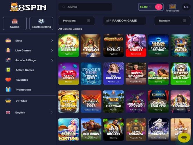 उदाहरण के लिए, 8Spin कैसीनो में 35 सॉफ्टवेयर स्टूडियो हैं, और हालांकि यह सबसे बड़ी संख्या नहीं है जो हमने देखी है, लेकिन इनमें से अधिकांश को सर्वश्रेष्ठ माना जाता है। कुछ प्रदाताओं के नाम इस प्रकार हैं: Net Entertainment, Big Time Gaming, Evolution Gaming, Novomatic, Play'n GO, playson, Quickspin, Relax Gaming, Yggdrasil, Wazdan, Pragmatic Play, Nolimit City, Red Tiger Gaming, Spinomenal, Fugaso, Fantasma Games, Skywind, BGAMING, Electric Elephant Games, Slot Factory, Mancala Gaming, Blue Guru Games, Tom Horn Gaming, Wild Streak Gaming, 4ThePlayer, AvatarUX, Max Win Gaming, Peter And Sons, Absolute Live Gaming, PoggiPlay, Spribe, Jili, Print Studios, Four Leaf Gaming, Reel Kingdom, VoltEnt and Sneaky Slots
