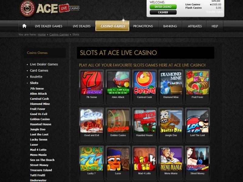ऐस लाइव कैसीनो में 21 वीडियो स्लॉट्स का एक छोटा सा संग्रह उपलब्ध है, और मौजूद गेम पुराने लगते हैं और उनमें कई अन्य ऑनलाइन सट्टेबाजी साइटों जैसी सुविधाएँ नहीं हैं। इस समय कोई प्रोग्रेसिव जैकपॉट भी उपलब्ध नहीं है।