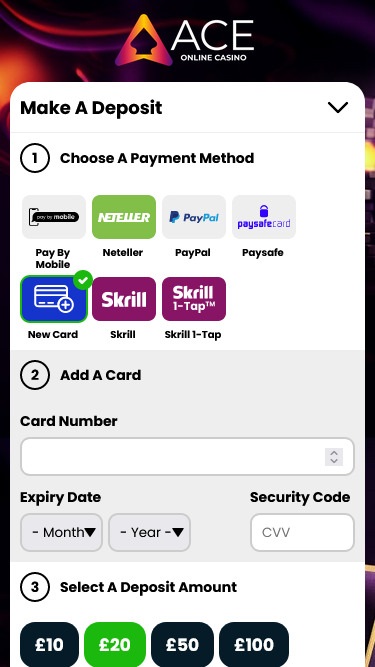 Ace Online Casino निम्नलिखित देशों के खिलाड़ियों को स्वीकार नहीं करता है: अफ़ग़ानिस्तान, Alabama, अलैंड द्वीप समूह, अलास्का, अल्बानिया, अल्बर्टा, आइल ऑफ़, एलजीरिया, अमेरिकी समोआ, एंडोरा, अंगोला, एंगुइला, अंटार्कटिका, अण्टीगुआ और बारबूडा, अर्जेंटीना, एरिज़ोना, अर्कांसस, आर्मीनिया, अरूबा, ऑस्ट्रेलिया, ऑस्ट्रिया, आज़रबाइजान, बहामा, बहरीन, बांग्लादेश, बारबाडोस, बेलोरूस, बेल्जियम, बेलीज़, बेनिन, बरमूडा, भूटान, बोलीविया, बोस्निया और हर्जेगोविना, बोत्सवाना, बौवेट द्वीप, ब्राज़िल, ब्रिटिश कोलंबिया, ब्रिटिश हिंद महासागर क्षेत्र, ब्रुनेई, बुल्गारिया, बुर्किना फासो, बुस्र्न्दी, कैलिफोर्निया, कंबोडिया, कैमरून, कनाडा, केप वर्ड, केमन द्वीपसमूह, केन्द्रीय अफ़्रीकी गणराज्य, काग़ज़ का टुकड़ा, चिली, चीन, क्रिसमस द्वीप, कोकोस (कीलिंग) द्वीप समूह, कोलंबिया, कोलोराडो, कोमोरोस, कांगो, कांगो लोकतांत्रिक गणराज्य, कनेक्टिकट, कुक आइलैंड्स, कोस्टा रिका, हाथीदांत का किनारा, क्रोएशिया, क्यूबा, कुराकाओ, साइप्रस, चेक रिपब्लिक, डीसी, डेलावेयर, डेनमार्क, ज़िबूटी, डोमिनिका, डोमिनिकन गणराज्य, इक्वेडोर, मिस्र, अल साल्वाडोर, इक्वेटोरियल गिनी, इरिट्रिया, एस्तोनिया, इथियोपिया, फ़ॉकलैंड द्वीप समूह (माल्विनास), फ़रो द्वीप समूह, फिजी, फिनलैंड, फ्लोरिडा, फ्रांस, फ्रेंच गुयाना, फ़्रेंच पोलिनेशिया, फ्रांसीसी दक्षिणी क्षेत्र, गैबॉन, गाम्बिया, जॉर्जिया, जॉर्जिया, जर्मनी, घाना, जिब्राल्टर, ग्रीस, ग्रीनलैंड, ग्रेनेडा, ग्वाडेलोप, गुआम, ग्वाटेमाला, गिनी, गिनी-बिसाऊ, Guyana, हैती, हवाई, हर्ड द्वीप और मैकडोनाल्ड द्वीप, होंडुरस, हांगकांग, हंगरी, आइसलैंड, इडाहो, इलिनोइस, भारत, इंडियाना, इंडोनेशिया, आयोवा, ईरान, इराक, आयरलैंड, मैन द्वीप, इज़राइल, इटली, जमैका, जापान, जर्सी, जॉर्डन, कान्सास, कजाखस्तान, केंटकी, केन्या, किरिबाती, कोरिया, लोकतांत्रिक जनवादी गणराज्य, कोरिया गणराज्य, कुवैट, किर्गिज़स्तान, लाओस, लातविया, लेबनान, लिसोटो, लाइबेरिया, लीबिया, लिकटेंस्टाइन, लिथुआनिया, लुइसियाना, लक्समबर्ग, मकाउ, मेडागास्कर, मैंने, मलावी, मलेशिया, मालदीव, माली, माल्टा, मैनिटोबा, मार्शल द्वीपसमूह, मार्टीनिक, मैरीलैंड, मैसाचुसेट्स, मॉरिटानिया, मॉरीशस, मैयट, मेक्सिको, मिशिगन, माइक्रोनेशिया, संघीय राज्य, मिनेसोटा, मिसिसिपी, मिसौरी, मोल्दाविया, मोनाको, मंगोलिया, MONTANA, मोंटेनेग्रो, मोंटेसेराट, मोरक्को, मोज़ाम्बिक, म्यांमार, नामिबिया, नाउरू, नेब्रास्का, नेपाल, नीदरलैंड, नीदरलैंड एंटिलीज़, नेवादा, कनाडा का एक प्रांत, नया केलडोनिया, न्यू हैम्पशायर, न्यू जर्सी, न्यू मैक्सिको, न्यूयॉर्क, न्यूज़ीलैंड, न्यूफाउंडलैंड और लैब्राडोर, निकारागुआ, नाइजर, नाइजीरिया, नियू, नॉरफ़ॉक द्वीप, उत्तर