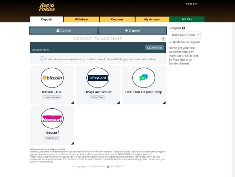ऐस पोकीज़ कैसीनो की बैंकिंग प्रणाली अच्छी है, हालाँकि इसकी गति थोड़ी कमज़ोर है। कैसीनो वायर ट्रांसफ़र, मास्टरकार्ड, वीज़ा, स्क्रिल, नेटेलर और पेसेफ़कार्ड के ज़रिए जमा और भुगतान स्वीकार करता है, लेकिन एक बार में भुगतान की सीमा $3,000 तक सीमित है, और बड़ी जीत का भुगतान किश्तों में किया जाता है। कुछ अन्य साइटों की तुलना में भुगतान का समय धीमा है, क्योंकि ऐस पोकीज़ में जीत पर 72 घंटे का पेंडिंग समय होता है, जो निराशाजनक है। इसके बाद ई-वॉलेट विकल्पों का भुगतान 15 मिनट में हो जाता है, लेकिन वायर ट्रांसफ़र में भुगतान होने में 5-10 दिन लग सकते हैं।