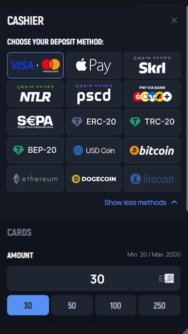 💰 न्यूनतम जमा€3 (Crypto)/€20 (Other methods)