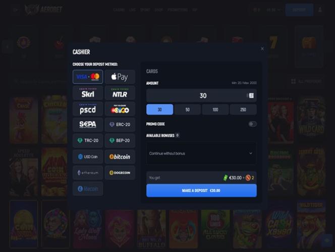 भुगतान विधियों के संबंध में, आप Aerobet पर अपने फंड को प्रबंधित करने के लिए कई बैंकिंग विकल्पों का उपयोग कर सकते हैं, जिनमें Visa , Mastercard, Skrill , MiFinity, Apple Pay , Paysafecard और MB Way शामिल हैं। यह ब्रांड Bitcoin, Dogecoin , Ethereum , Litecoin , USD Coin और Tether जैसी कई क्रिप्टोकरेंसी भी स्वीकार करता है।