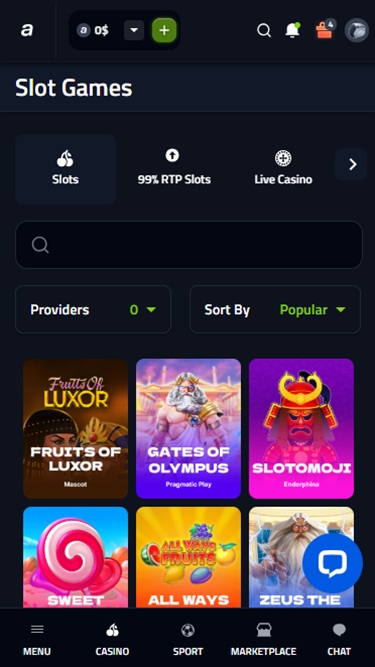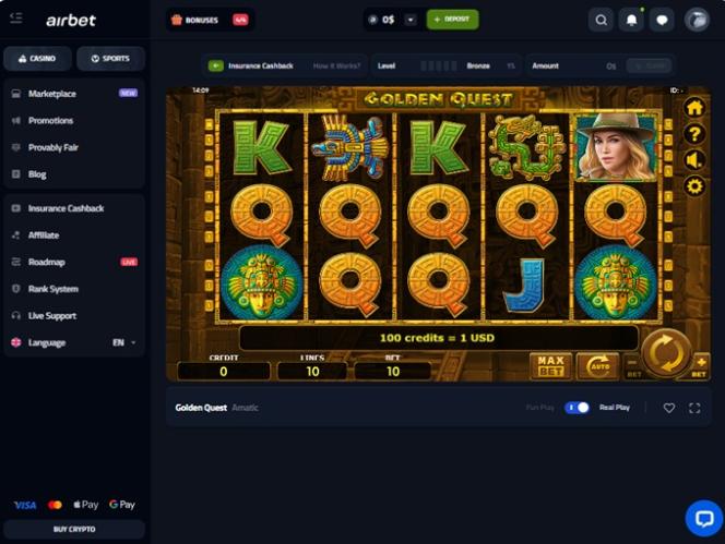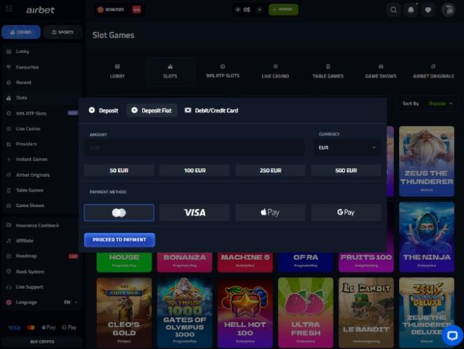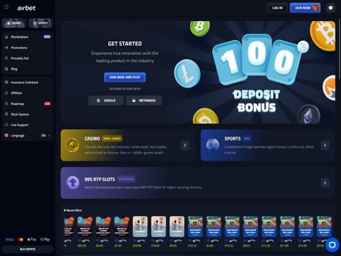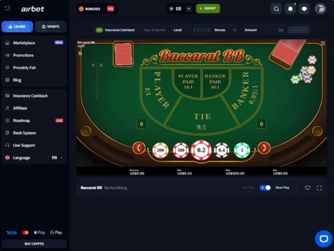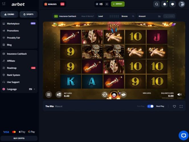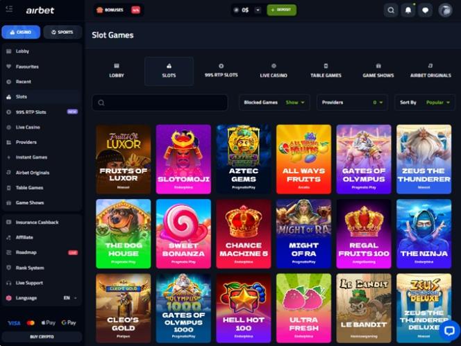 कैसीनो का इंटरफ़ेस एक सुव्यवस्थित लेआउट वाला है, जिसमें ट्रेंडिंग गेम्स और बेट्स पर ज़ोर दिया गया है। इसमें बाईं ओर एक मुख्य मेनू और शानदार ढंग से व्यवस्थित श्रेणियाँ और उप-खंड हैं, जो खिलाड़ियों को उनके पसंदीदा गेम्स तक आसानी से पहुँचने में मदद करते हैं। आधुनिक क्रिप्टो गेम्स के प्रशंसक एयरबेट के मूल गेम्स के लिए समर्पित एक सेक्शन पाकर खुश होंगे, जिसमें एयर क्रैश नामक एक लोकप्रिय क्रैश-प्रकार का गेम भी शामिल है।