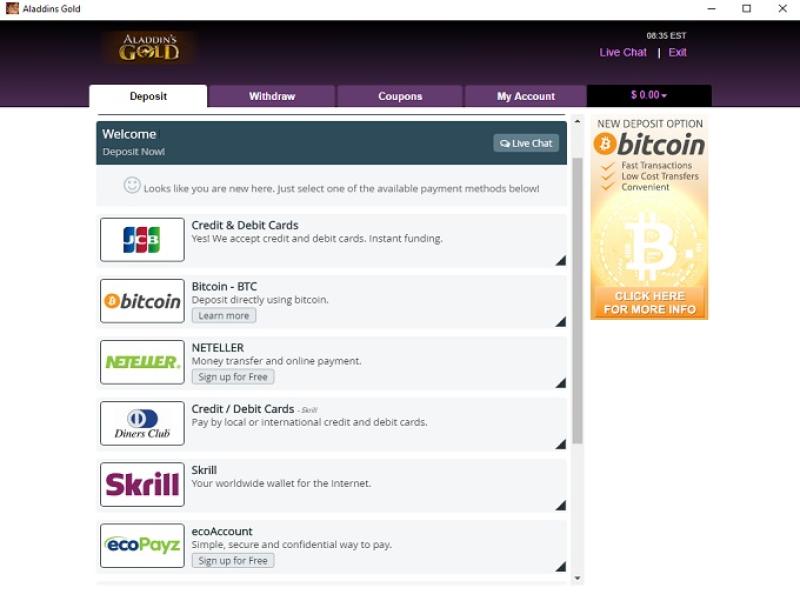 Aladdins Gold Casino पर बैंकिंग विकल्प