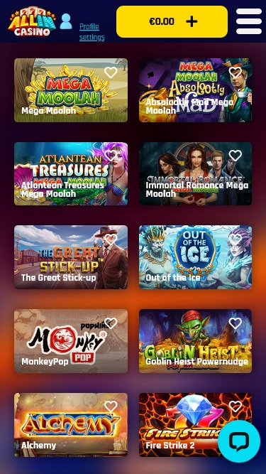ऑल इन कैसीनो में एक आकर्षक जुआ लॉबी है जो कुछ iGaming दिग्गजों जैसे इवोल्यूशन गेमिंग, नेटएंट, रिलैक्स गेमिंग , क्विकस्पिन द्वारा निर्मित लोकप्रिय ऑनलाइन कैसीनो खिताबों से भरी हुई है...