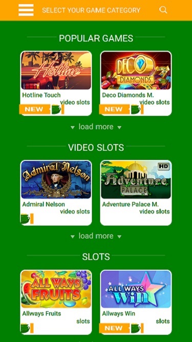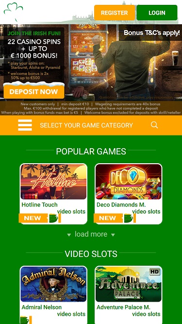 सभी आयरिश कैसीनो Microgaming, Net Entertainment, Amatic Industries, Barcrest, Big Time Gaming, Thunderkick, Games Global, Bally Technologies, Blueprint Gaming, NextGen, WMS and Scientific Games द्वारा संचालित है, और इसके खेल एक वेब-आधारित प्लेटफॉर्म के साथ-साथ एक मोबाइल साइट के माध्यम से प्रदान किए जाते हैं।Blackjack