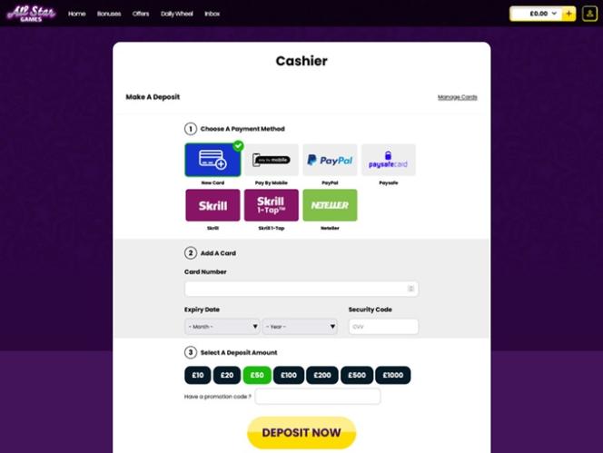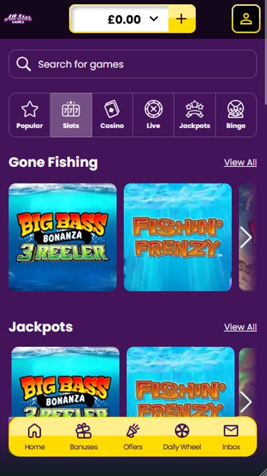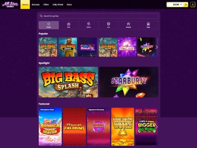 ऑल स्टार गेम्स में ढेरों वीडियो और क्लासिक वीडियो स्लॉट उपलब्ध हैं, जिनमें नेट एंटरटेनमेंट, नेक्स्टजेन गेमिंग और अन्य जैसे बड़े डेवलपर्स द्वारा बनाए गए शीर्षक शामिल हैं। कैसीनो में कुछ मोबाइल गेम भी उपलब्ध हैं, जिसका मतलब है कि आप जहाँ भी डेटा कनेक्शन उपलब्ध हो, वहाँ से रीलों को स्पिन कर सकते हैं।