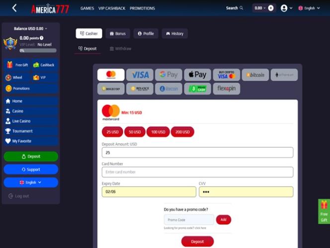 ऑपरेटर अपने कैसीनो सदस्यों के साथ काफी उदार है और एक आकर्षक लॉयल्टी स्कीम के अलावा, यह कैसीनो बोनस और प्रमोशन का एक उल्लेखनीय सेट भी प्रदान करता है। अमेरिका777 कैसीनो में, जुआरी एक आकर्षक परिचयात्मक ऑफर के साथ-साथ बोनस चिप्स, कैशबैक, मैनेजर बोनस, डिपॉज़िट मैचिंग, व्हील बोनस और बहुत कुछ का आनंद ले पाएंगे।