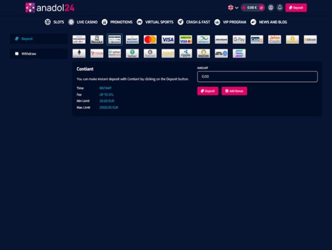 2025 में स्थापित, Anadol24 एक नया ऑनलाइन कैसीनो है जो कनाडा, जर्मनी, ऑस्ट्रिया और न्यूज़ीलैंड के खिलाड़ियों को स्वीकार करता है। यह जुआ साइट ऑनलाइन स्लॉट, लाइव डीलर, टेबल गेम, क्रैश गेम और यहाँ तक कि वर्चुअल स्पोर्ट्स विकल्पों सहित हज़ारों गेम प्रदान करके एक अविस्मरणीय गेमिंग अनुभव प्रदान करने का वादा करती है। एक मज़बूत प्रचार योजना और क्रिप्टो उपलब्धता के साथ, इसमें कोई आश्चर्य की बात नहीं है कि इसने इतने कम समय में इतने बड़े दर्शक वर्ग को आकर्षित किया।