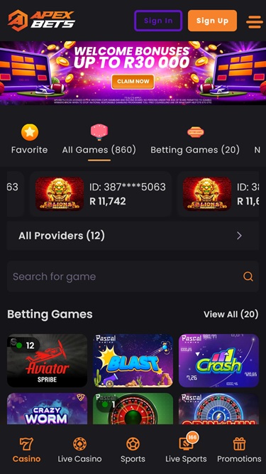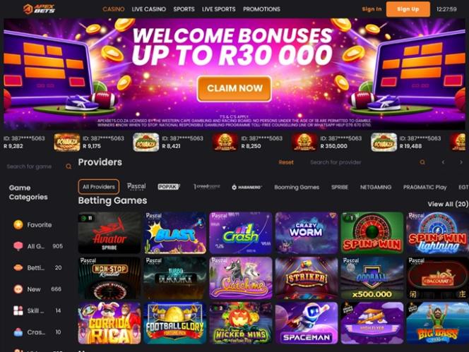 Apex Bets एक दक्षिण अफ्रीकी-अनुकूल ऑनलाइन कैसीनो है जो एक अविस्मरणीय जुआ अनुभव का वादा करता है, जिसमें कैसीनो गेम और स्पोर्ट्स बेटिंग विकल्पों का एक बड़ा चयन शामिल है, जिसमें वास्तविक धन स्लॉट, लाइव डीलर , टेबल गेम और इंस्टेंट क्रैश गेम शामिल हैं।