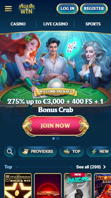 साइट पर कदम रखते ही, एक्वाविन कैसीनो पहली नज़र में ही आपकी गहरी छाप छोड़ देता है। अपने नाम के अनुरूप, यह पानी के अंदर की थीम पर आधारित है, जिसमें जीवंत नीली पृष्ठभूमि और गहरे सुनहरे रंग इसे एक ताज़ा और आकर्षक रूप देते हैं। नेविगेशन सरल है, हर सेक्शन आसानी से दिखाई देता है, इसलिए आपको अपनी ज़रूरत की चीज़ ढूँढ़ने में समय बर्बाद नहीं करना पड़ेगा।
