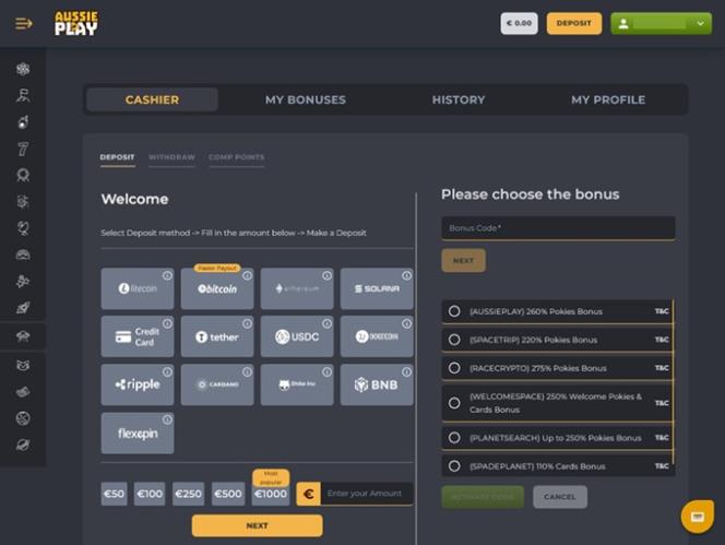 ऑसीप्ले पर बैंकिंग अच्छी है, साइट क्रेडिट कार्ड, बैंक ट्रांसफर या बिटकॉइन के ज़रिए जमा और निकासी स्वीकार करती है। बिटकॉइन पैसे ट्रांसफर करने का सबसे तेज़ तरीका है, क्योंकि कैसीनो से पैसे क्लियर होते ही आपको तुरंत पैसे मिल जाने चाहिए। न्यूनतम निकासी सीमा $150 है, और साइट प्रति लेनदेन $2,500 तक की निकासी की सीमा रखती है।