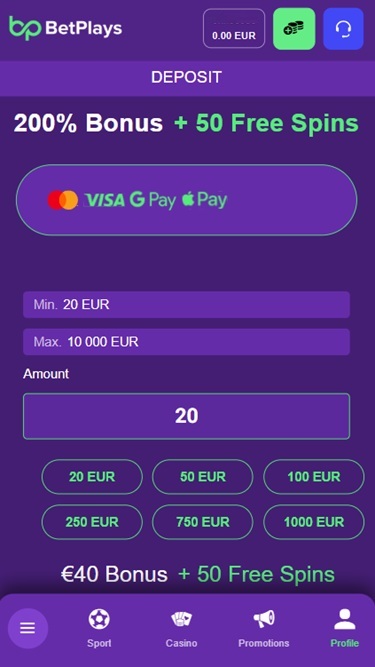 चूंकि बेट प्लेज़ कैसीनो एक जुआ स्थल है जो विभिन्न आकर्षक सट्टेबाजी खेल और आयोजनों की पेशकश करता है, इसलिए खेल सट्टेबाजों के लिए दो स्वागत बोनस ऑफर हैं।
