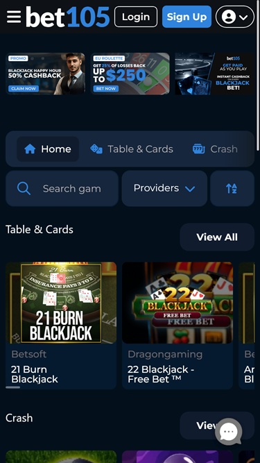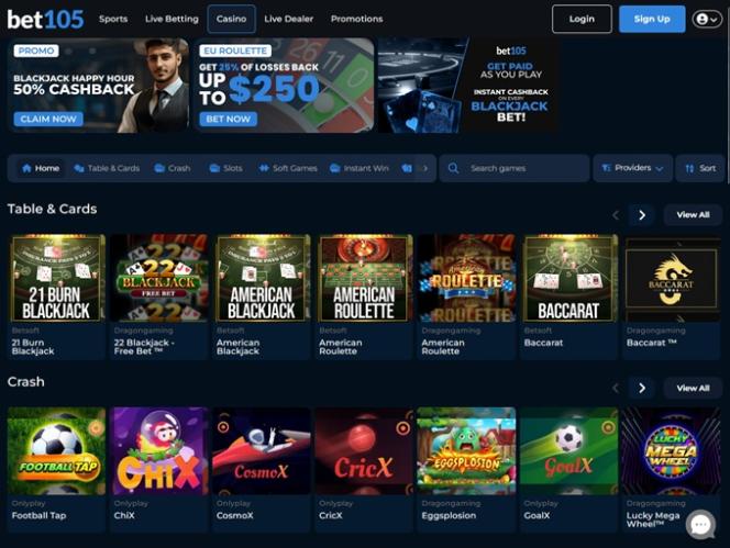 Bet105 एक क्रिप्टो और यूएसए-अनुकूलस्पोर्ट्सबुक और ऑनलाइन कैसीनो है जिसने कैसीनो के होमपेज पर आते ही हमारा ध्यान आकर्षित किया, जिसमें ब्लैकजैक जैसे विभिन्न प्रकार के ऑनलाइन कैसीनो गेम, शानदार माहौल और आकर्षक लेआउट शामिल हैं, जिससे हमें पहले ही क्लिक से आसानी से नेविगेट करने में मदद मिली।