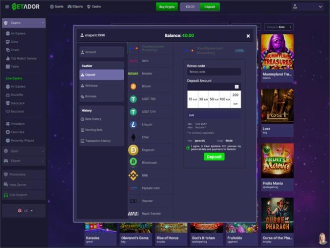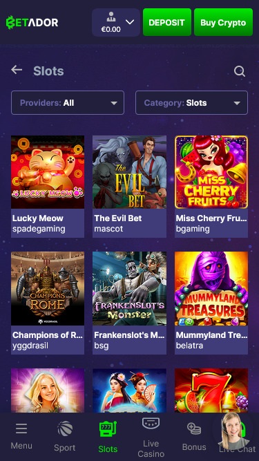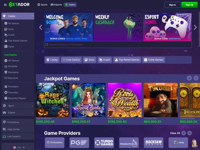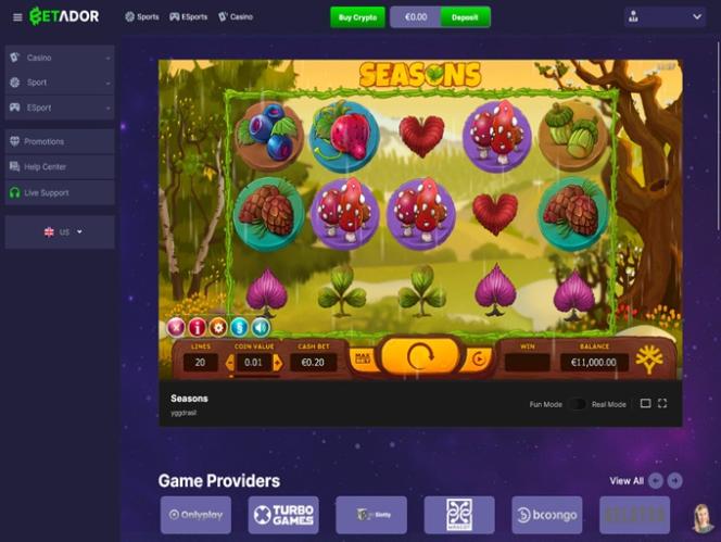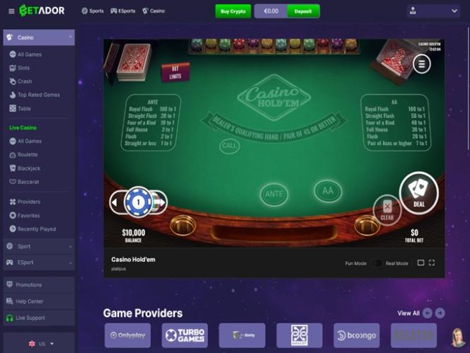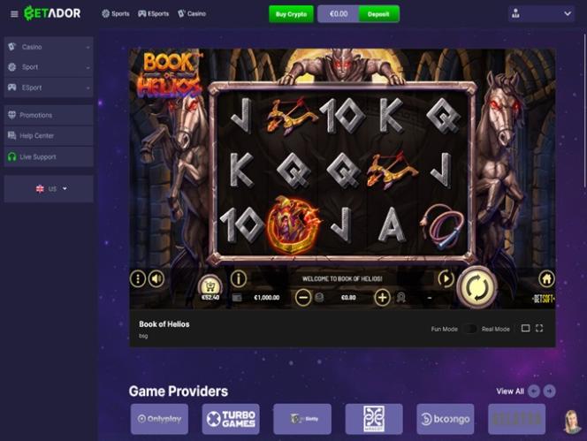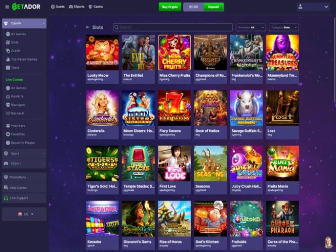 लॉबी, लाइव कैसीनो, स्लॉट्स, क्रैश, टॉप रेटेड गेम्स और टेबल गेम्स कैसीनो सेक्शन की मुख्य श्रेणियां हैं। हालाँकि हमने पहले से कहीं ज़्यादा बड़ी गेमिंग लाइब्रेरी देखी हैं, फिर भी खिलाड़ी बीटाडोर पर कई तरह की शैलियों को आज़मा सकेंगे, जिनमें लोकप्रिय क्रिप्टो गेम्स भी शामिल हैं जिनमें आधुनिक कैसीनो सदस्यों की विशेष रुचि है।