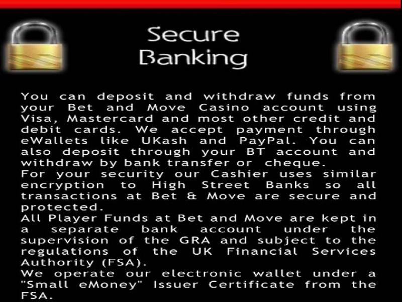 बेट एंड मूव कैसीनो Probability द्वारा संचालित है, और कैसीनो के सभी गेम स्मार्टफोन और टैबलेट जैसे मोबाइल उपकरणों पर वितरित किए जाते हैं।Bet&Move Casino पर बैंकिंग विकल्प