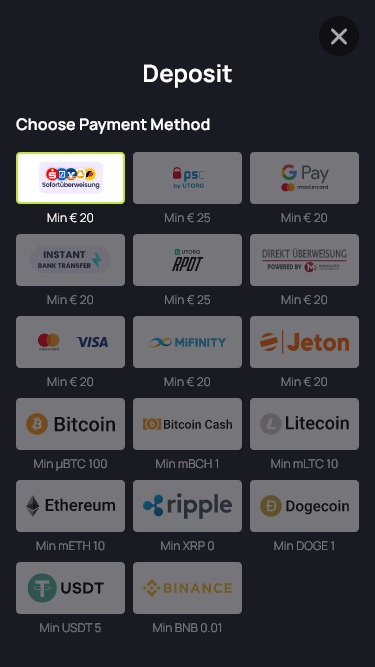यह ऑपरेटर वित्तीय लेनदेन के लिए विश्वसनीय भुगतान विकल्प प्रदान करता है। खिलाड़ी डेबिट और क्रेडिट कार्ड, नेटेलर और स्क्रिल जैसे लोकप्रिय ई-वॉलेट, सीधे बैंक हस्तांतरण आदि का उपयोग कर सकते हैं। यह आधुनिक जुआ वेबसाइट BTC और अन्य क्रिप्टोकरेंसी का समर्थन करती है, इसलिए खिलाड़ियों के पास क्रिप्टो वॉलेट का विकल्प भी उपलब्ध है।