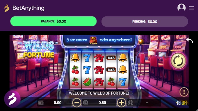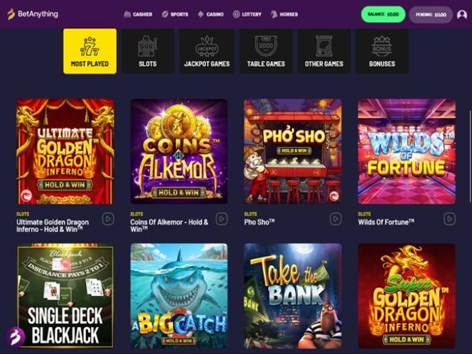 यहां कुछ अमेरिकी अनुकूल स्लॉट गेम दिए गए हैं, जो BetAnything के कैसीनो के सेट में उपलब्ध हैं: गोल्डन बफेलो, ईयर ऑफ द रैबिट, लैरी का लकी टैवर्न, विनलोच कीप, रील्स एंड व्हील्स, पांडा गो वाइल्ड, ए नाइट विद क्लियो, 777 डीलक्स, मिस्ट्रेस ऑफ द सी, स्लॉट मैडनेस, स्पिन्स ऑफ इंडिपेंडेंस, हॉरोस्कोप, डिनो गैंगस्टर्स, रील्स ऑफ पोशन्स, फार्मर बनाम रैबिट, थ्रोन्स कॉन्क्वेस्ट, मिस्टर लेप्रेचुन, आयरिश शैमरॉक, स्पोर्टफिशिंग क्लब, अरेबियन ट्रेजर, स्पिन्स ऑफ ज़ीउस, 88 फ्रेन्ज़ी, कॉइन्स ऑफ क्रिसमस होल्ड एंड विन, अल्टीमेट गोल्डन ड्रैगन इन्फर्नो होल्ड एंड विन, वाइल्ड्स ऑफ फॉर्च्यून, ए बिग कैच होल्ड एंड विन, ट्रिपल लकी 8, कॉइन्स ऑफ अल्केमोर होल्ड एंड विन, कैशेन गॉड ऑफ फॉर्च्यून होल्ड एंड विन, टेक द वॉल्ट होल्ड एंड विन, गोल्डन डेस्टिनी होल्ड एंड विन, हॉट लकी 7s, गोल्ड पैंथर, गोल्ड वेस्ट, फ्रूट्स मेनिया, स्पिन एंड विन, टिकी रश, स्नेक ट्रेजर, रिवर ऑफ गोल्ड, और भी बहुत कुछ।