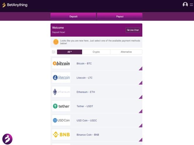 बेटएनीथिंग का कैशियर सभी कैसीनो सदस्यों को एक सहज बैंकिंग अनुभव प्रदान करने के लिए डिज़ाइन किया गया है। वेबसाइट विश्वसनीय बैंकिंग विधियों का समर्थन करती है, जिसमें बैंक वायर ट्रांसफ़र, चेक और क्रिप्टोकरेंसी भुगतान विकल्पों की एक विस्तृत श्रृंखला शामिल है।