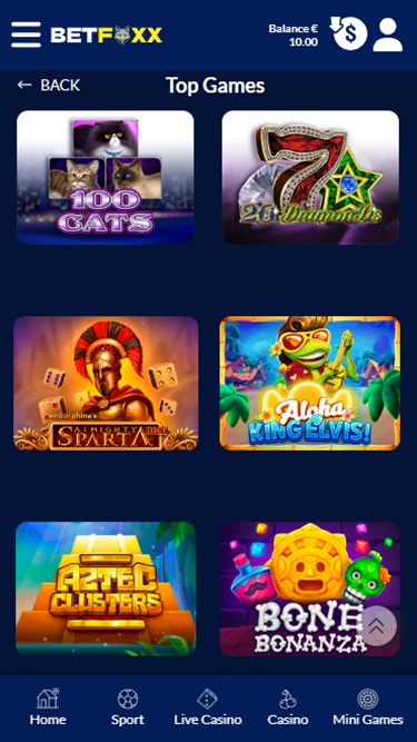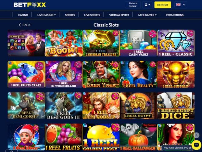 ऑपरेटर के पास लगभग तीन हज़ार गेम्स का संग्रह है, और हमें पूरा विश्वास है कि खिलाड़ी इन्हें खेलते हुए कभी बोर नहीं होंगे। BetFoxx के कुछ सबसे लोकप्रिय स्लॉट गेम्स हैं: 100 कैट्स, 20 डायमंड्स, ऑलमाइटी स्पार्टा, अलोहा किंग एल्विस, बफैलो होल्ड एंड विन, बुक ऑफ कैट्स, बोन बोनान्ज़ा, ड्रैगन्स एलिमेंट डीलक्स, गेट्स ऑफ ओलिंपस, ग्रेस ऑफ क्लियोपेट्रा, हॉट ट्रिपल सेवन्स, लकी ओएसिस, मेगा ग्रेटेस्ट कैच बोनस बाय, मिस चेरी फ्रूट्स जैकपॉट पार्टी, राइज़ ऑफ ट्राइटन, और भी बहुत कुछ।