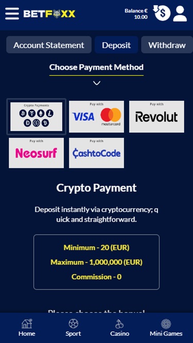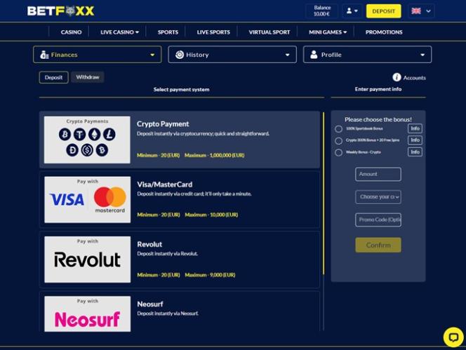 कैसीनो कैशियर भुगतान विकल्पों की एक विस्तृत श्रृंखला प्रदान करता है, हालाँकि उपलब्ध विकल्प इस बात पर निर्भर करते हैं कि आप कहाँ से खेल रहे हैं। लेकिन चिंता करने की कोई ज़रूरत नहीं है - चुनने के लिए ढेरों विकल्प मौजूद हैं, चाहे आप BetFoxx को किसी भी जुआ क्षेत्राधिकार से एक्सेस कर रहे हों।