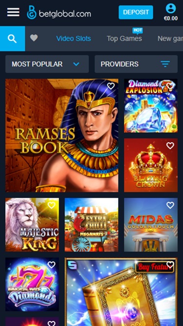अगर आपको ऑनलाइन स्लॉट्स गेम्स पसंद हैं, तो BetGlobal कैसीनो में आपके पास चुनने के लिए बेजोड़ विकल्प मौजूद हैं। यहाँ खिलाड़ियों के लिए सबसे लोकप्रिय विकल्पों की बात करें तो, आपको इन गेम्स पर विचार करना चाहिए: रैम्सेस बुक, डायमंड एक्सप्लोजन 7s, जे मेनिया गोल्डन एग्स, मैजेस्टिक किंग, एक्स्ट्रा चिली मेगाक्वेज़, इम्मोर्टल वेव डायमंड्स, ब्लेज़िंग क्राउन, बुक ऑफ़ डेमिगॉड्स II, लेडी वुल्फ मून मेगावेज़, मिडास गोल्डन टच और क्रेज़ी डायमंड्स।