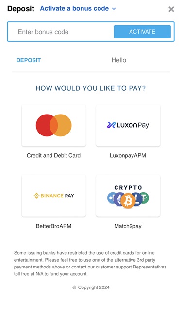 हमें यह देखकर खुशी हो रही है कि ब्रांड खिलाड़ियों को भुगतान विकल्पों के मामले में बेहद विस्तृत विकल्प प्रदान करता है। शुरुआत के लिए, वीज़ा , मास्टरकार्ड , एस्ट्रोपे , जेटॉन और इंटरएक जैसे पारंपरिक तरीके उपलब्ध हैं। इसके अलावा, क्रिप्टो जमा और निकासी भी स्वीकार की जाती है, और उपलब्ध मुद्राएँ बिटकॉइन , एथेरियम , लाइटकॉइन , टीथर , ट्रॉन और रिपल हैं।