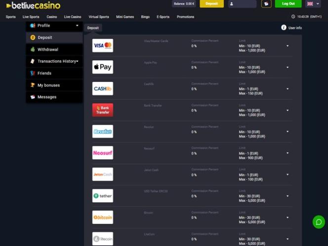 बेटलाइव कैसीनो अपने खिलाड़ियों को बैंकिंग के ढेरों विकल्प प्रदान करता है। पारंपरिक बैंकिंग विधियों के अलावा, खिलाड़ी ऐप्पल पे , एस्ट्रोपे , बैंक वायर ट्रांसफर , मास्टरकार्ड , वीज़ा , जेटॉन और अन्य विकल्पों का उपयोग कर सकते हैं।