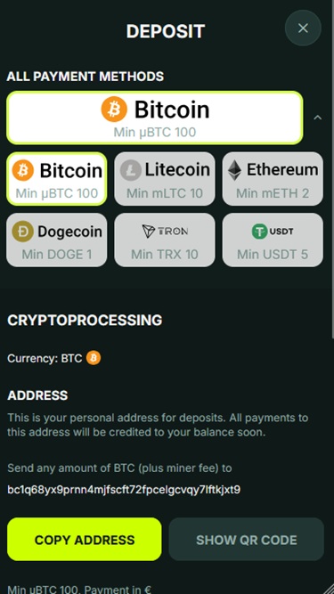 यह कैसिनो फिएट मुद्राओं और क्रिप्टोकरेंसी दोनों को स्वीकार करता है।
