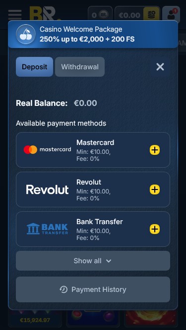 कैसिनो अपने विवेक के अनुसार खिलाड़ी के खाते में जमा की जाने वाली न्यूनतम और अधिकतम राशि निर्धारित करने का अधिकार सुरक्षित रखता है।