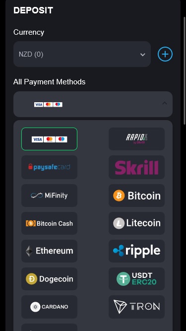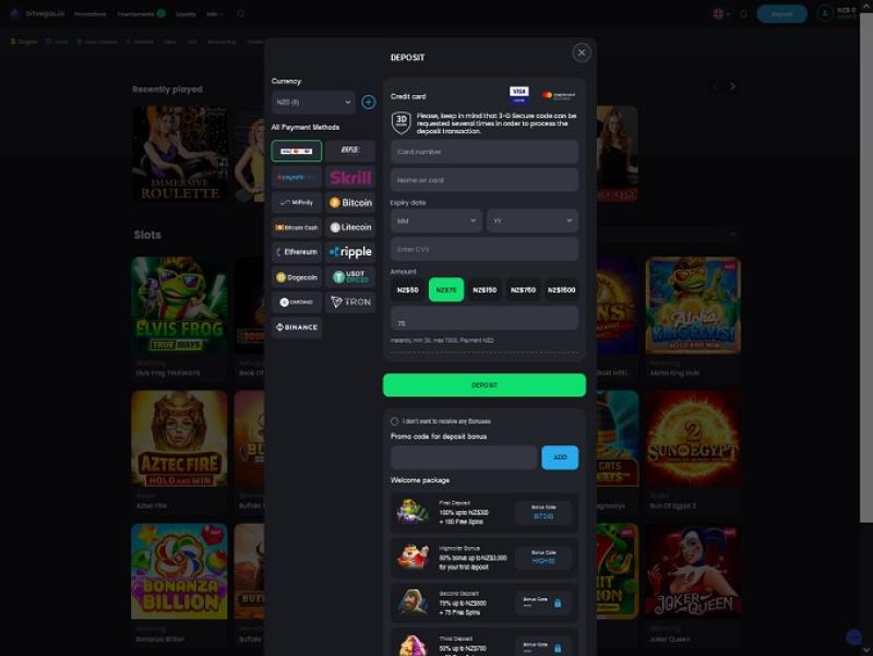 बिटवेगास कैसीनो में कई अलग-अलग जमा विकल्प उपलब्ध हैं। क्रिप्टोकरेंसी के अलावा, खिलाड़ी मास्टरकार्ड, वीज़ा और नेटेलर जैसे लोकप्रिय विकल्पों के ज़रिए भी जमा कर सकते हैं। खिलाड़ी चाहें तो स्क्रिल के ज़रिए भी जमा कर सकते हैं।