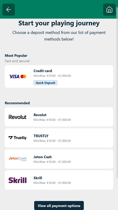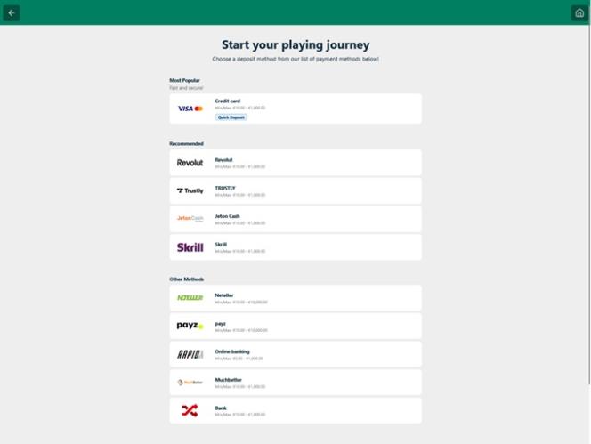 भुगतान विकल्पों की बात करें तो, आपके पास अपने धन का प्रबंधन करने के लिए कई विकल्प उपलब्ध हैं, जिनमें Skrill , Neteller , Apple Pay , Bank Wire Transfer, MuchBetter, Payz , Trustly और Google Pay शामिल हैं। इसके अलावा, कैसीनो बिटकॉइन , बिटकॉइन कैश, एथेरियम , लाइटकॉइन , टीथर और रिपल सहित विभिन्न क्रिप्टोकरेंसी स्वीकार करता है।