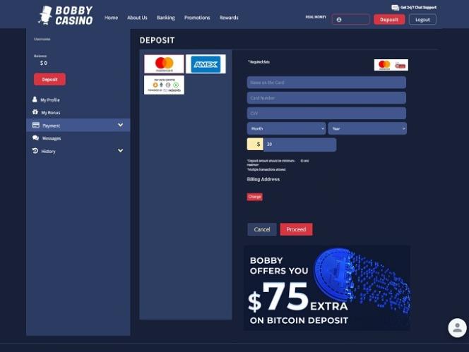 नए खाते के पंजीकरण की प्रक्रिया सरल और तेज़ है और यह सीधे उपयोगकर्ता-अनुकूल खिलाड़ी के डैशबोर्ड पर ले जाती है - वहाँ कोई परेशानी नहीं है। पहली नज़र में यह अच्छा लगा; बॉबी कैसीनो एक अच्छा जुआ वातावरण प्रदान करता है, इसलिए हम उपलब्ध ऑनलाइन कैसीनो गेम्स देखने के लिए उत्साहित थे!
