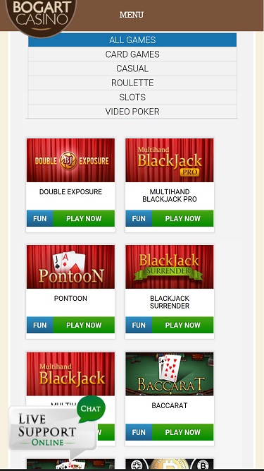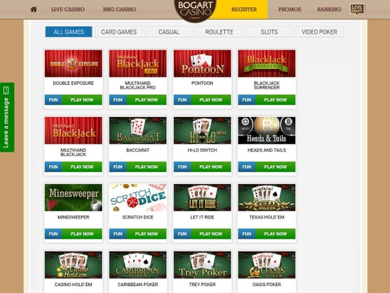 मानक कैसीनो खेलों के अलावा बोगार्ट कैसीनो अपने ग्राहकों को लाइव डीलर सेवाएं भी प्रदान करता है।