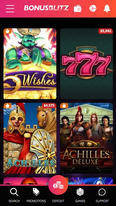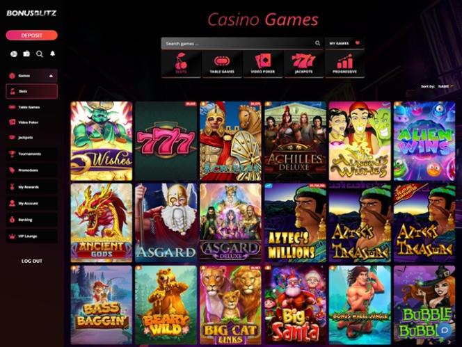 बोनस ब्लिट्ज़ कैसीनो में, आप रियलटाइम गेमिंग द्वारा विकसित किए गए ऑनलाइन स्लॉट्स की एक अच्छी संख्या देखने की उम्मीद कर सकते हैं। इस कैसीनो के कुछ सबसे लोकप्रिय उत्पाद हैं 5 विशेस, अकिलीज़ असगार्ड डीलक्स, क्लियोपेट्राज़ गोल्ड, फॉर्च्यून्स ऑफ़ ओलंपस और हेनहाउस।