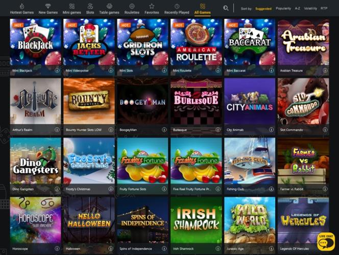 यहाँ कुछ उपलब्ध स्लॉट गेम्स दिए गए हैं: आर्थर्स रियल्म, स्पेल्स एंड पोशन्स, रेलवे रिचेस, फ्रूटी फॉर्च्यून, बाउंटी हंटर्स, लीजेंड्स ऑफ हरक्यूलिस, नाइट्स कॉन्क्वेस्ट, पाइरेट्स रिवेंज, सर्पेंट्स ट्रेजर, रेट्रो साइंस-फिक्शन, विक्ट्री लेन, जुरासिक फायर स्लॉट्स, टचडाउन फीवर! स्लॉट्स, वाइल्ड 7's...