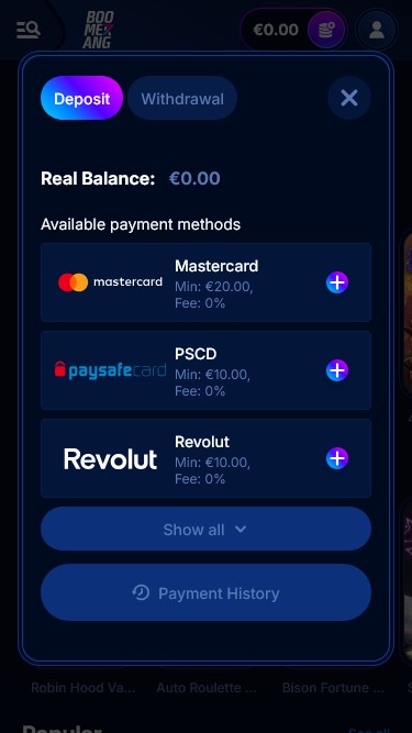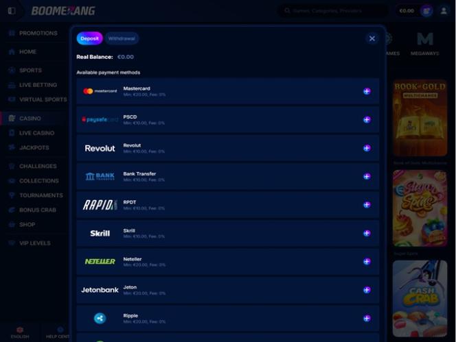 भुगतान विधियों की बात करें तो, बूमरैंग बेट इसमें भी कोई कमी नहीं छोड़ता, क्योंकि यह कई तरह के भुगतान विकल्प प्रदान करता है। ई-वॉलेट और बैंकिंग कार्ड जैसे आम भुगतान विकल्पों के अलावा, आप बिटकॉइन, डॉगकॉइन, यूएसडीटी और कई अन्य क्रिप्टोकरेंसी का भी उपयोग कर सकते हैं!