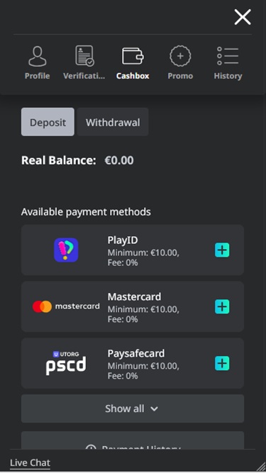 लाइव-डीलर अनुभाग सबसे अधिक मांग वाले कैसीनो खिलाड़ियों को भी निराश नहीं करेगा क्योंकि यह लोकप्रिय हिट्स से भरा है: क्लब रॉयल रूलेट, स्वीट बोनान्ज़ा कैंडीलैंड, क्लब रॉयल ब्लैकजैक 1, क्लब रॉयल ब्लैकजैक 2, क्रेजी टाइम, स्पीड रूलेट, ब्लैकजैक लॉबी, वन ब्लैकजैक, लाइटनिंग रूलेट, क्लब रॉयल ब्लैकजैक 3, मोनोपॉली लाइव, मेगा सिक बो, रूलेट लॉबी...
