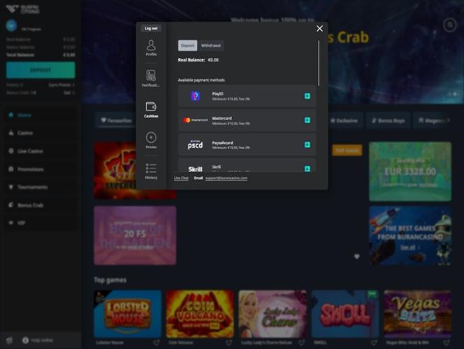 बुरान कैसीनो विभिन्न विश्वसनीय भुगतान प्रणालियों का समर्थन करता है जैसे कि प्रीपेड, डेबिट और क्रेडिट भुगतान कार्ड, कुछ गेमिंग क्षेत्राधिकारों में लोकप्रिय ई-वॉलेट का एक विविध सेट, प्रत्यक्ष स्थानान्तरण और क्रिप्टोकरेंसी बैंकिंग विधियां।