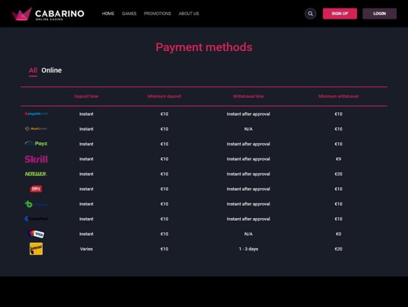 साइट रिस्पॉन्सिव है, जिसका मतलब है कि डिवाइस की स्क्रीन का आकार या प्रकार चाहे जो भी हो, खिलाड़ी अपनी पसंदीदा सामग्री का आनंद बिना किसी समस्या के ले पाएंगे। दूसरी ओर, यह कहना उचित होगा कि गेम थंबनेल की सामग्री को फ्रेम में फिट करने के लिए अनुकूलित किया जाना चाहिए, क्योंकि कई मामलों में गेम के शीर्षक स्पष्ट रूप से दिखाई नहीं देते हैं और उन्हें बेहतर स्थिति में रखना चाहिए। इसके अलावा, कैबरिनो कैसीनो उपयोगकर्ता के अनुकूल और अच्छी तरह से अनुकूलित है।