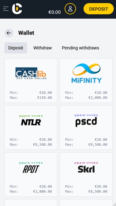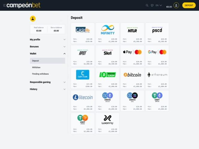 कैंपियनबेट की बैंकिंग प्रणाली काफी अच्छी है, क्योंकि कैसीनो जेटॉन, वीज़ा, इकोपेज़, मास्टरकार्ड, सोफोर्ट, मल्टीबैंको, स्क्रिल और नेटेलर के माध्यम से जमा और निकासी स्वीकार करता है। कैसीनो सभी भुगतानों को 12 घंटों के भीतर संसाधित करता है, और बैंकिंग विकल्पों पर कोई शुल्क नहीं लगता है।