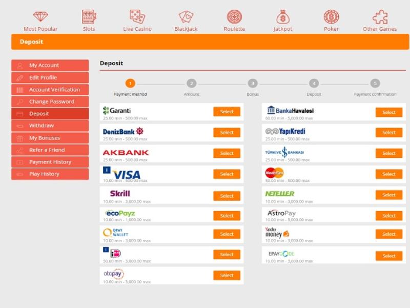 बैंकिंग प्रणाली काफी अच्छी है, क्योंकि कैसीनो बैंक ट्रांसफर, iDeal, मास्टरकार्ड, Skrill, Neteller, Visa, ecoPayz और AstroPay का समर्थन करता है। जीत की राशि जमा करने का समय 24 घंटे है, लेकिन ई-वॉलेट से भुगतान एक दिन के भीतर हो जाता है। क्रेडिट कार्ड और बैंक ट्रांसफर पूरा होने में कुछ दिन ज़्यादा लग सकते हैं।