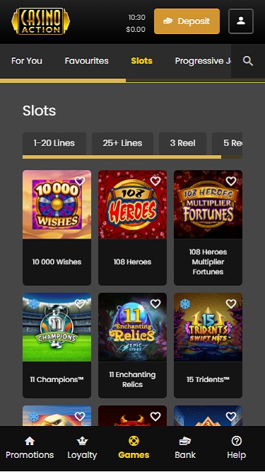 Casino Action में Slots सबसे बड़ी पेशकश हैं, जिनमें सैकड़ों टाइटल शामिल हैं, जिनमें कई ब्रांडेड गेम भी शामिल हैं जिनमें फ़िल्मी गुण शामिल हैं जिन्हें आप तुरंत पहचान लेंगे। इस कैसीनो में कई प्रोग्रेसिव जैकपॉट भी उपलब्ध हैं, जो खिलाड़ियों को कई सौ डॉलर से लेकर दस लाख डॉलर से भी ज़्यादा के नकद पुरस्कार जीतने का मौका देते हैं।