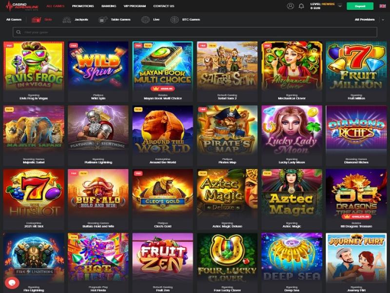 कैसीनो एड्रेनालाईन में खेलने के लिए सैकड़ों गेम उपलब्ध हैं, और कैसीनो माइक्रोगेमिंग और नेट एंटरटेनमेंट जैसे डेवलपर्स के स्लॉट भी प्रदान करता है। माइक्रोगेमिंग के प्रमुख प्रोग्रेसिव जैकपॉट भी उपलब्ध हैं, जो किसी भी समय लाखों डॉलर के इनाम प्रदान करते हैं।