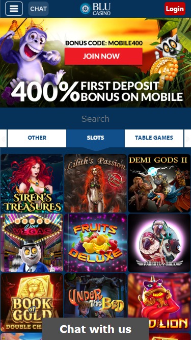 कैसीनो ब्लू BetSoft, Ezugi, Play'n GO, playson, Vivo Gaming, Wazdan, Booming Games, Booongo, LuckyStreak, Felix Gaming, Fugaso, Evoplay, SA Gaming, TVBet, Super Spade Games, Mr Slotty and SimplePlay द्वारा संचालित है, और कैसीनो की गेमिंग लाइब्रेरी एक वेब-आधारित प्लेटफॉर्म के माध्यम से प्रदान की जाती है और उन लोगों के लिए एक मोबाइल साइट भी है जो स्मार्टफोन या टैबलेट के माध्यम से खेलना चाहते हैं।अन्य खेल