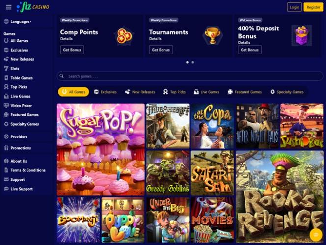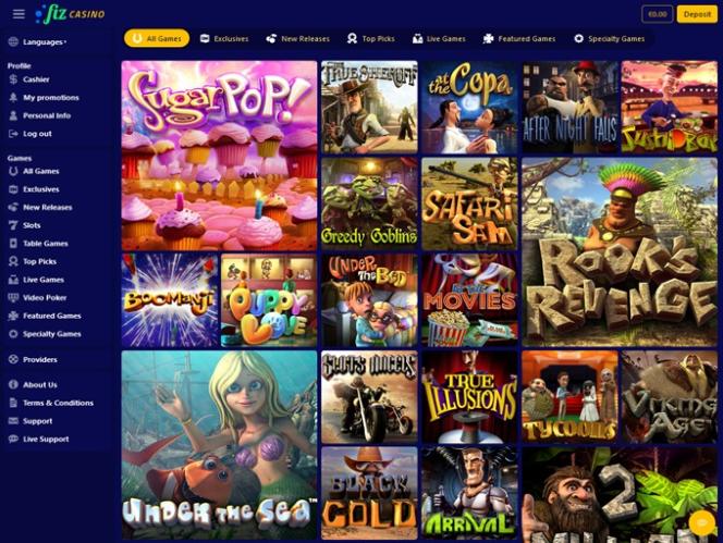 कैसीनो फ़िज़ BetSoft, Genesis Gaming, Rival, Saucify, Vivo Gaming, Arrows Edge, Radi8 Games, Fresh Deck Studios, Qora Games, Genii, Dragon Gaming and Dragoon Soft द्वारा संचालित है, और कैसीनो के खेल एक वेब-आधारित प्लेटफ़ॉर्म के माध्यम से उपलब्ध कराए जाते हैं। जो लोग अपने स्मार्टफ़ोन और टैबलेट पर कैसीनो गेम खेलना पसंद करते हैं, उनके लिए एक मोबाइल कैसीनो भी उपलब्ध है।अन्य खेल