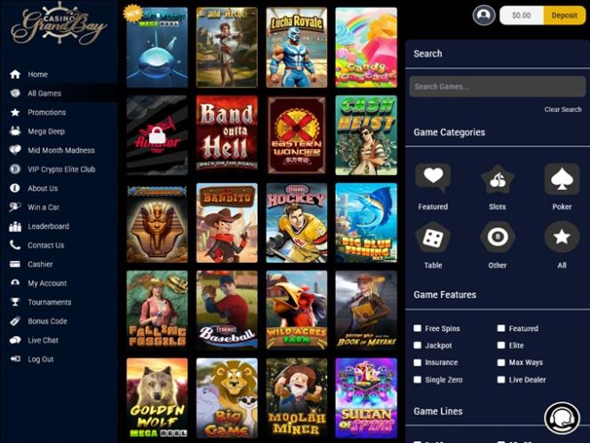 Casino Grand Bay की पेशकश में Slots का बड़ा योगदान है, जहाँ 30 से ज़्यादा अनोखे वीडियो स्लॉट उपलब्ध हैं। यहाँ ज़्यादा क्लासिक स्लॉट तो नहीं हैं, लेकिन Real Time Gaming जैसे डेवलपर के गेम्स खेलने के आदी खिलाड़ियों के लिए ये गेम्स अनोखे और मज़ेदार हैं।