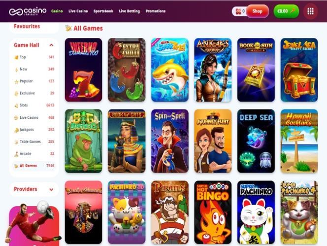 कैसीनो इन्फिनिटी के मालिकों और संचालकों ने इस काम को बखूबी समझा, क्योंकि उन्होंने 145 से ज़्यादा अलग-अलग सॉफ़्टवेयर प्रदाताओं को अपने साथ जोड़ा है। यह एक बहुत बड़ी संख्या है जो दूसरे कैसीनो में कम ही देखने को मिलती है, और हमें पूरा यकीन है कि यहाँ हर किसी के लिए कुछ न कुछ ज़रूर होगा। यहाँ के कुछ सबसे लोकप्रिय नाम हैं नेटएंट , स्पिनमैटिक, बेटसॉफ्ट, रिलैक्स गेमिंग, स्टेकलॉजिक और यग्द्रसिल गेमिंग।