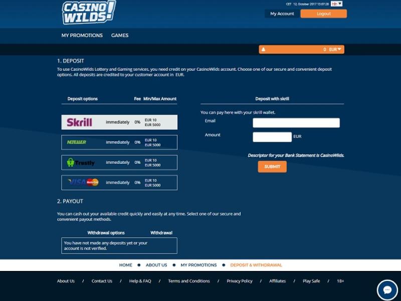 कैसीनो वाइल्ड्स की बैंकिंग प्रणाली अच्छी है, क्योंकि यह साइट नेटेलर, स्क्रिल, ट्रस्टली, वीज़ा, पगल पे, पेसेफकार्ड और बैंक ट्रांसफर के ज़रिए जमा और निकासी की सुविधा प्रदान करती है। कैसीनो की ख़ासियत यह है कि यह 48 घंटों के भीतर सभी जीत का भुगतान कर देता है। अगर यहाँ कुछ गड़बड़ है, तो वह यह है कि $100,000 से ज़्यादा की जीत का भुगतान 10 मासिक किश्तों में किया जा सकता है।